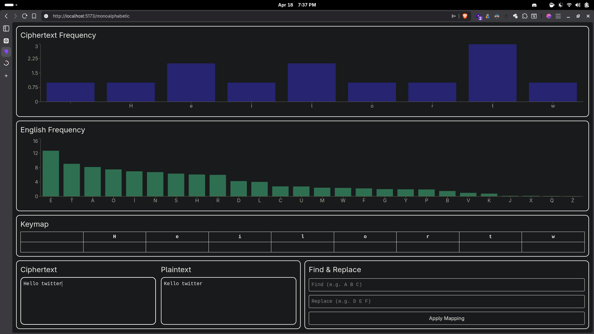 Worked on the component for ciphertext and plaintext. Nothing fancy, just two states that I have to manage. The plaintext state is going to be changed by the user’s actions. I’m going to have to put the changes that the user is going to apply in a stack of sorts, so even if the ciphertext is changed, I can just reapply the changes on the stack (for example, adding more text in the ciphertext field).