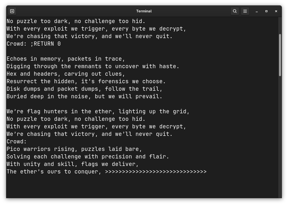 ;RETURN 0at the crowd prompt to go to the first line. - And we have the flag