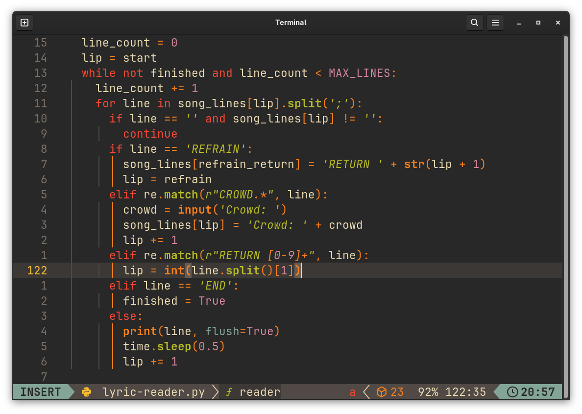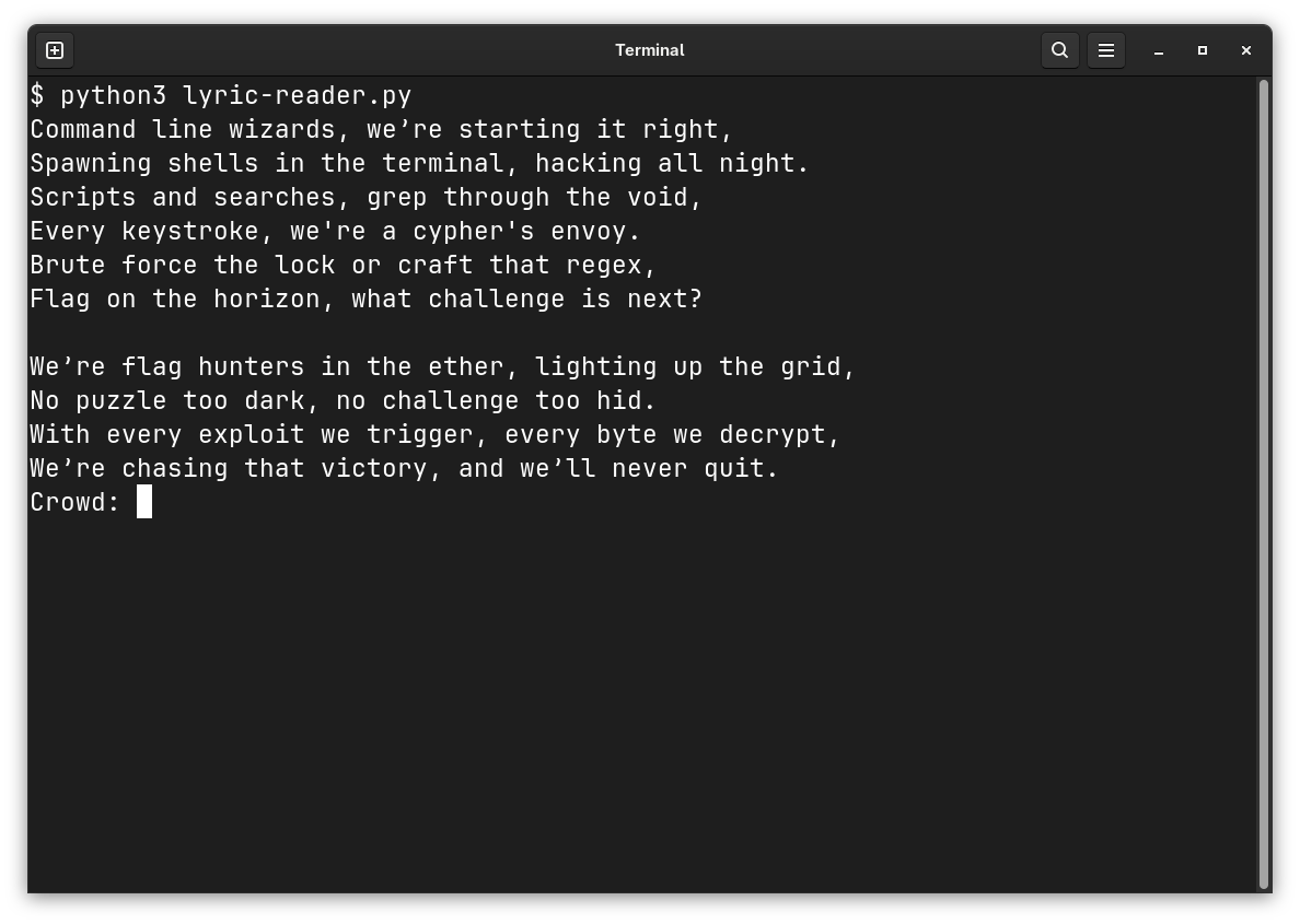 echo ">>>>>>>>>>>>>>>>>>>>>>>>>>>>>>>>>" > flag.txt- Running the script, we can see that it prints lyrics of a song and asks us for an input at the