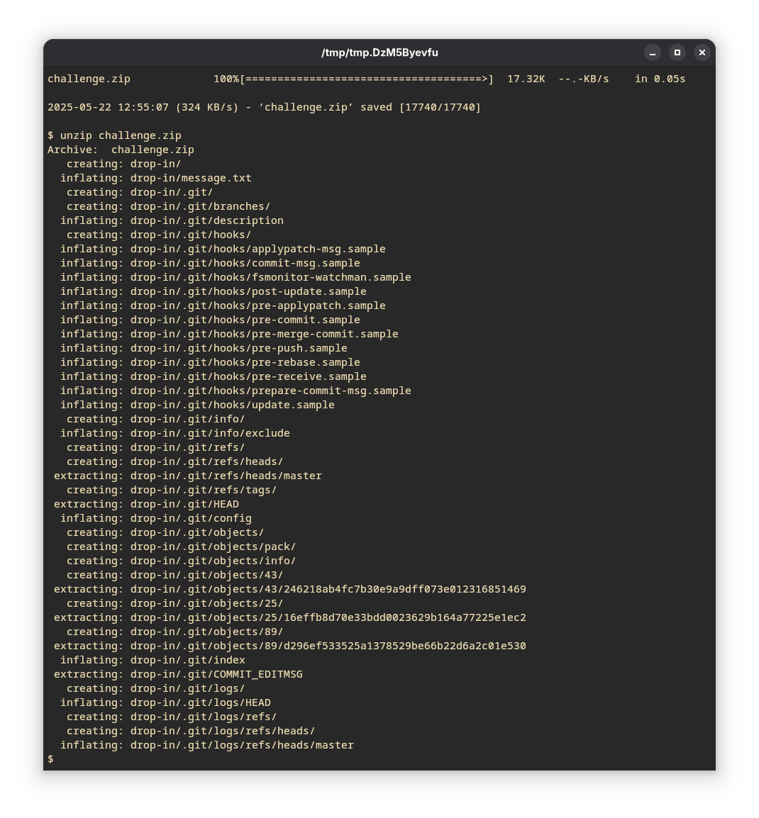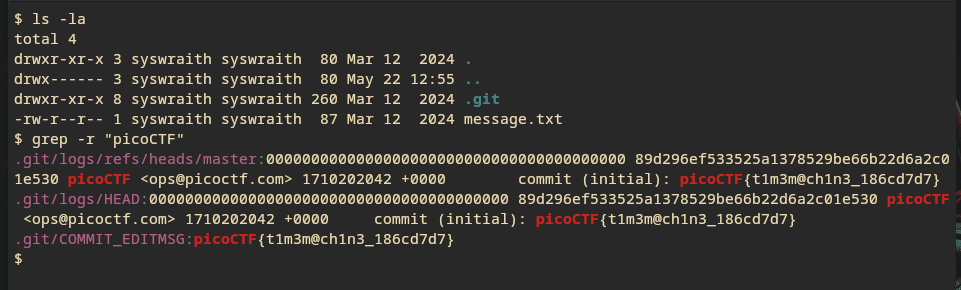 Download the file and unzip it cd into the file ls -la reveals the .git Use grep -r "picoCTF" to recursively grep for the flag.
