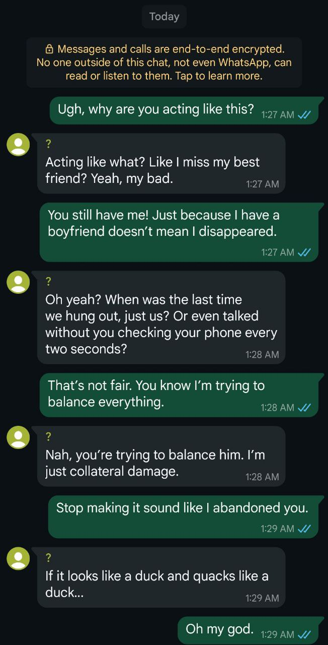 - Emotion-heavy conversations (My friends advised me against including this conversation because it isn’t suited for a blog-post, but I think its one of the best things I could have picked to test the capabilities of Deepseek!) Below are the examples of both of them, and their results. They’re not real conversations (obviously) but rather simulated with regards to being as real as possible.