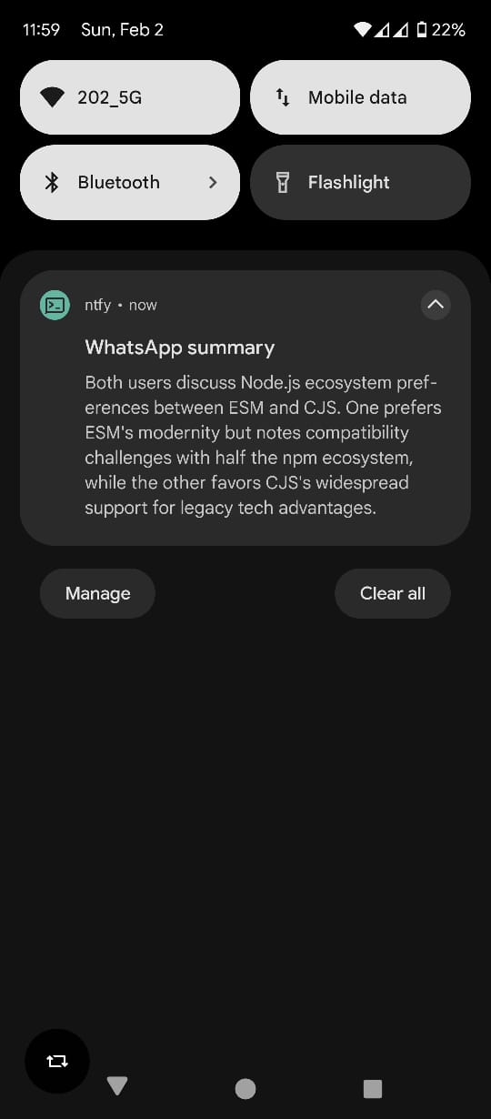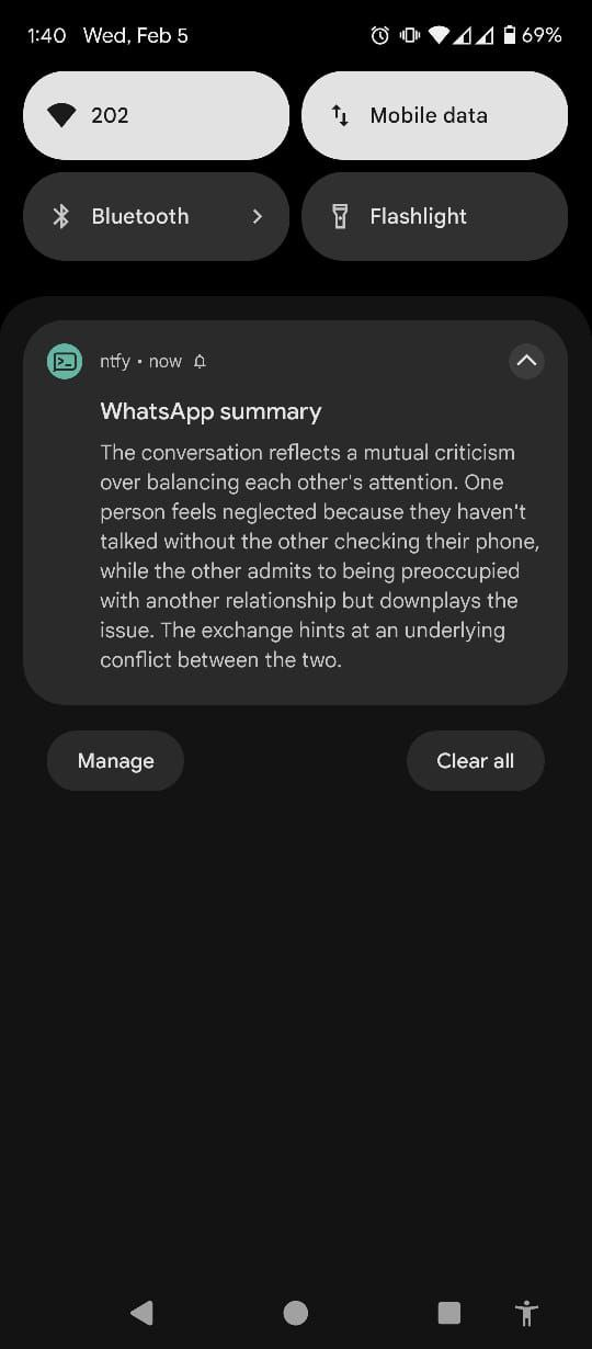 After seeing this fiasco play out, I wanted to implement something similar for Android. Of course, not every notification needs to be summarized (and we’re not dealing with reading phone notifications at all right now); but we’re going to summarize individual WhatsApp chats, since that’s where I think this feature will truly shine.