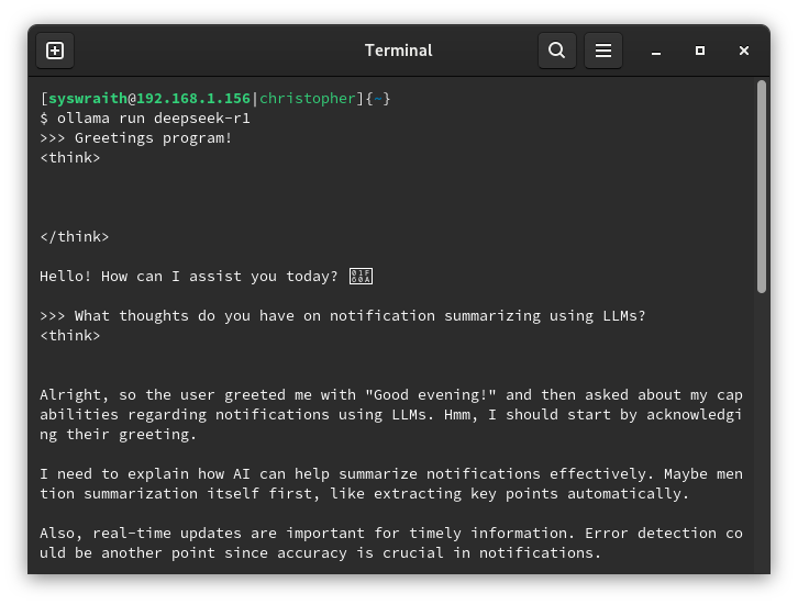 We have all the messages now. We just need to send it off to the Deepseek-r1 model. Here, we will be using a wrapper around the Ollama API.
